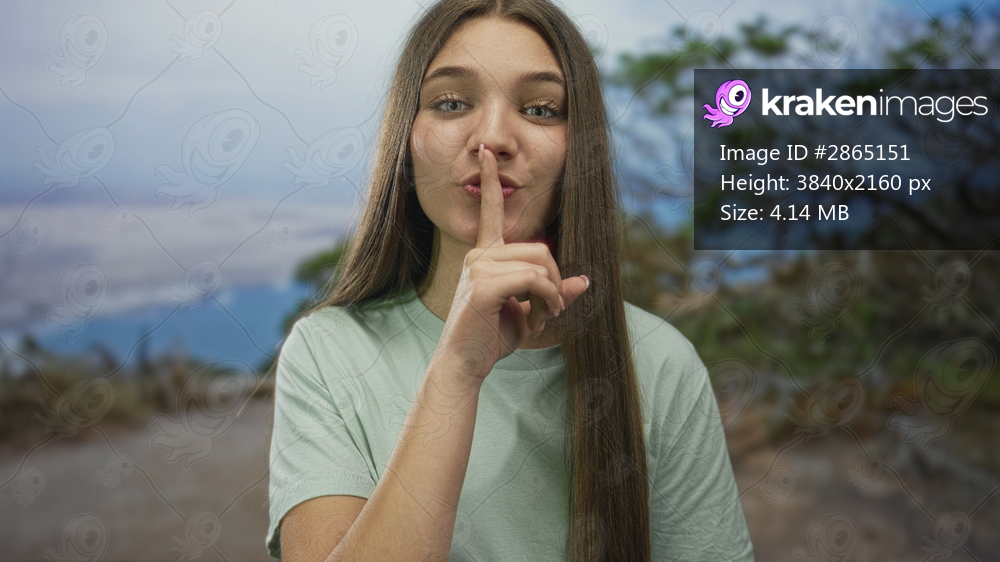 Caucasian woman holds finger to lips for silence along a winding green forest path under soft sunlight; serenity.