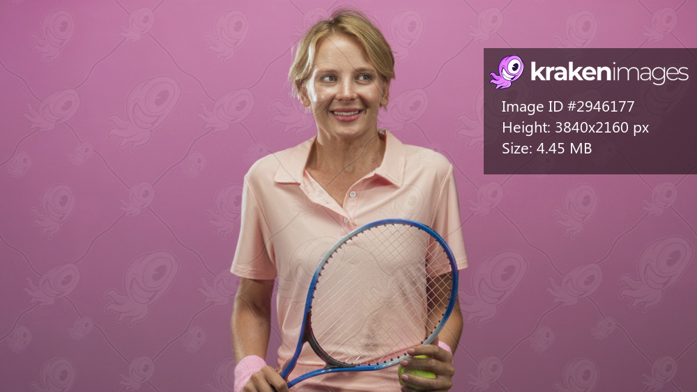 Caucasian woman holds tennis racket and ball with visible hands and smile in studio; cheerful confidence.