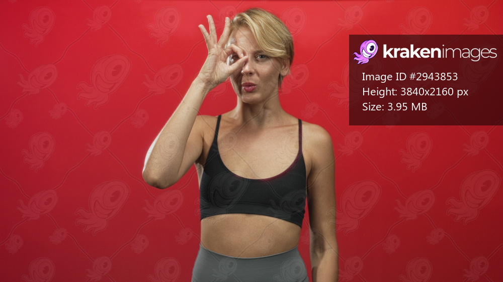 Caucasian woman in black sports bra makes ok sign to eye with hand, bare stomach visible in studio; playful confidence.