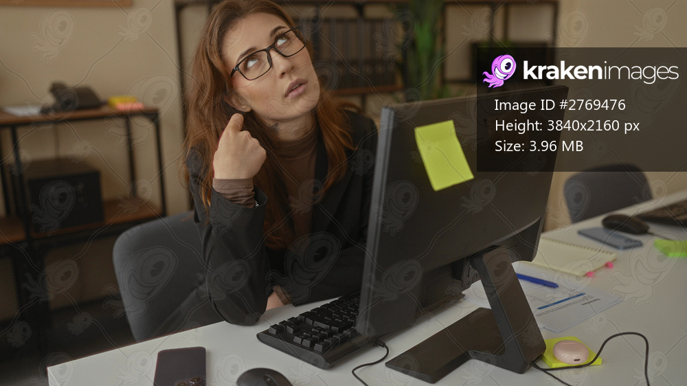 Caucasian woman in office looking stressed with computer and phone surrounded by work materials reflecting a busy workplace environment indoors.