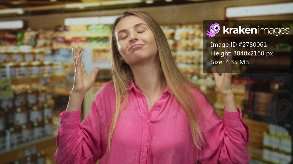 Caucasian woman in pink shirt joyfully dancing in a supermarket aisle with shelves in the background, expressing happiness and carefree spirit in a market environment. - Kraken Images