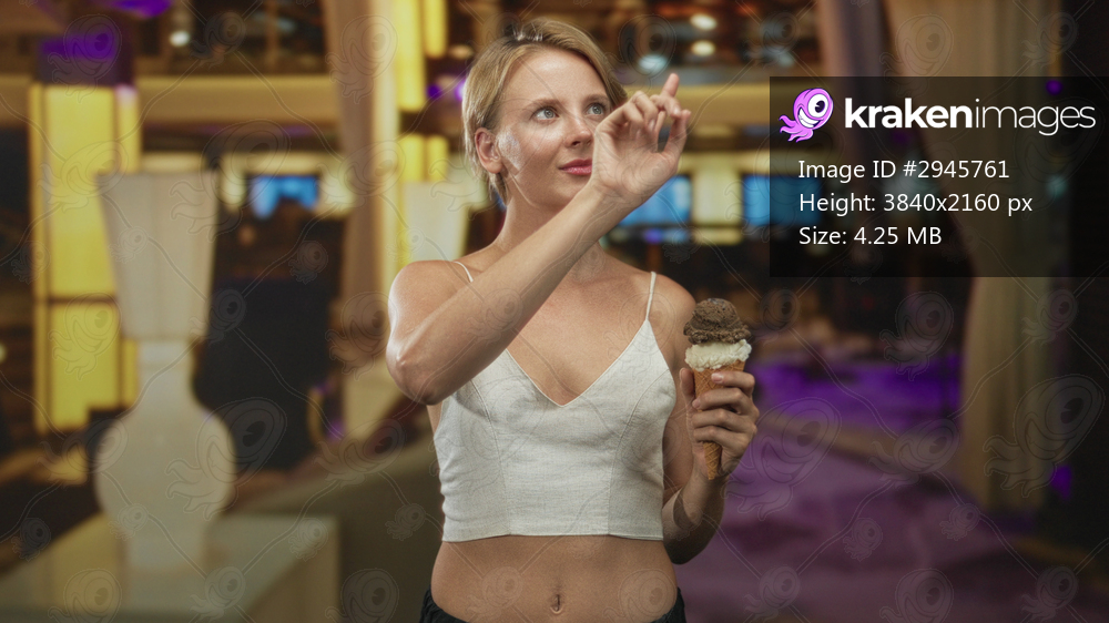 Caucasian woman in white crop top holds an ice cream cone and points finger upward while gazing up in a building foyer, showing mid motion gesture; curiosity contemplation. - Kraken Images