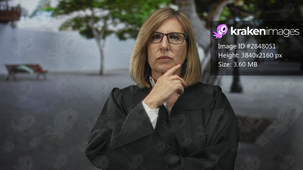 Caucasian woman judge wearing glasses and robe touching chin while standing in an outdoor street scene; deliberation.