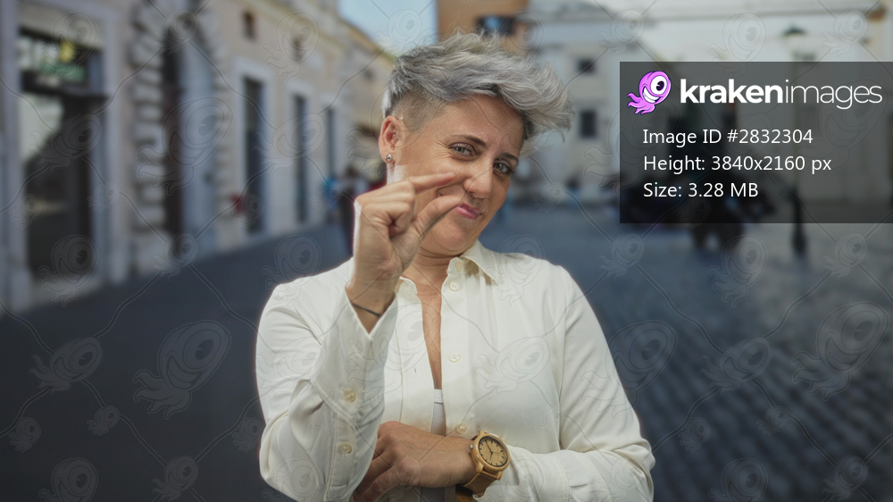 Caucasian woman pinches fingertips closely near her wristwatch on a sunny cobblestone street; skepticism.