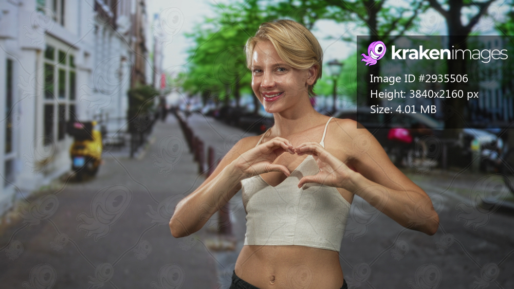Caucasian woman pointing with index fingers and forming a heart with hands, crop top showing midriff on a street; playful affection.