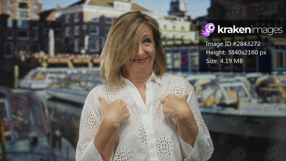 Caucasian woman with raised eyebrow in white blouse points thumbs to chest on street by canal boats; self doubt.