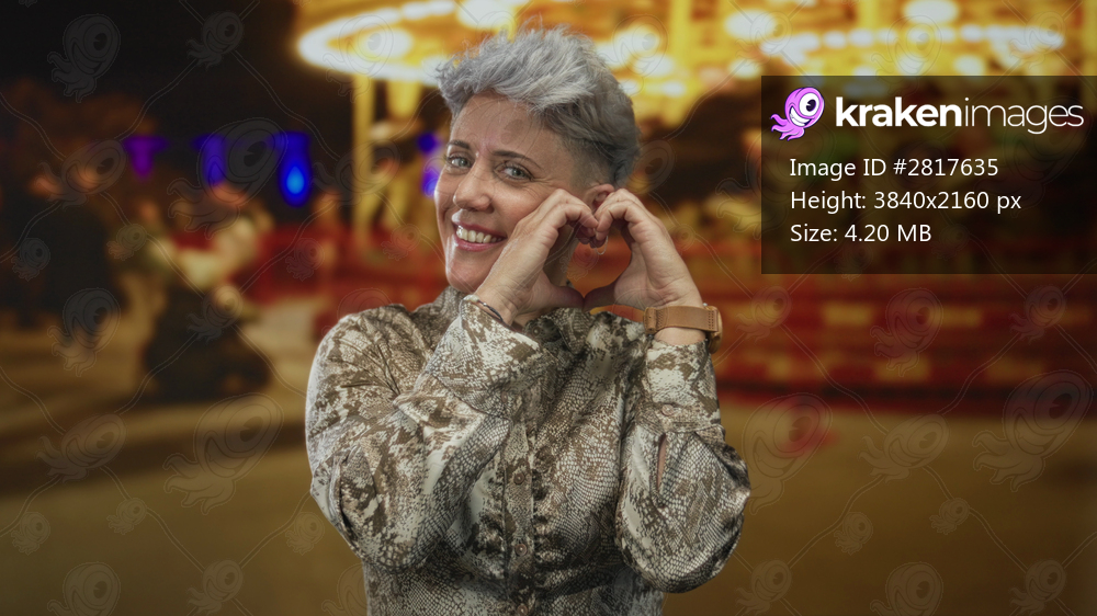 Caucasian woman with short grey hair forms heart gesture with both hands on city street at night with blurred carousel lights; love happiness.