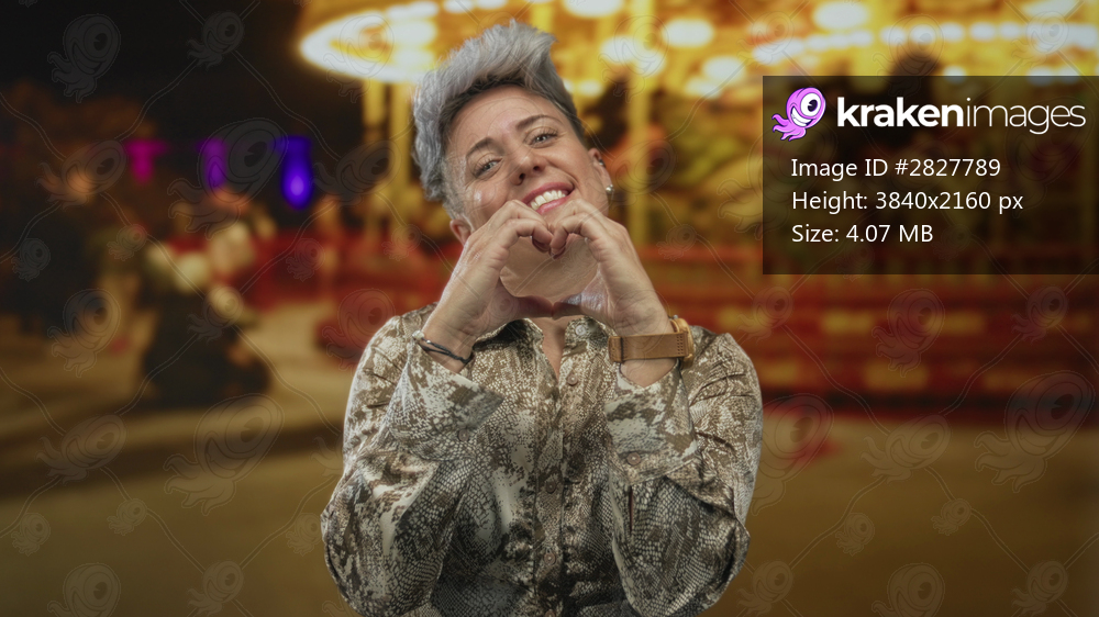 Caucasian woman with short grey hair forms heart gesture with both hands on city street at night with blurred carousel lights; love happiness.