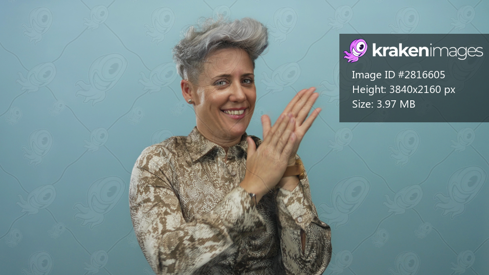 Caucasian woman with short grey hair presses palms together and smiles in a light blue studio while wearing a snakeskin print blouse; serenity.