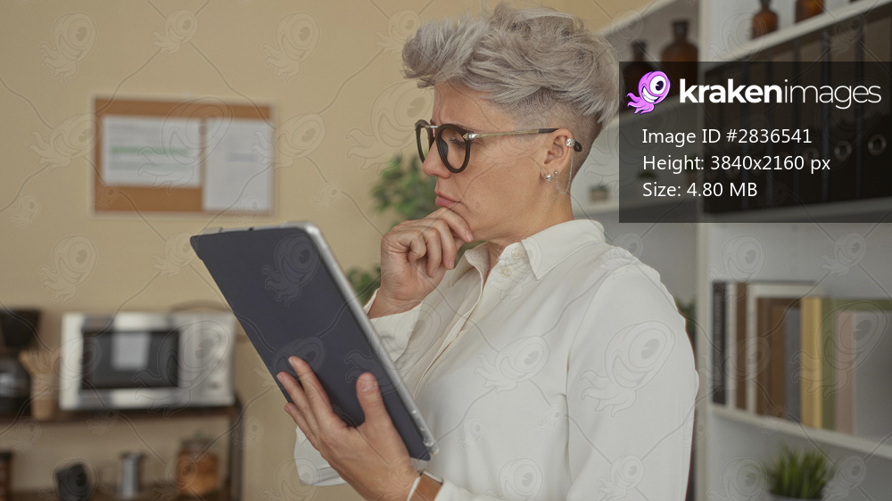 Caucasian woman with short hair and black glasses touches chin holding tablet in office building; contemplation.