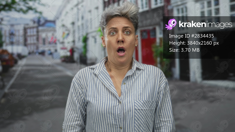 Caucasian woman with short hair clutches chest in striped shirt on busy city street lined with buildings; shock.