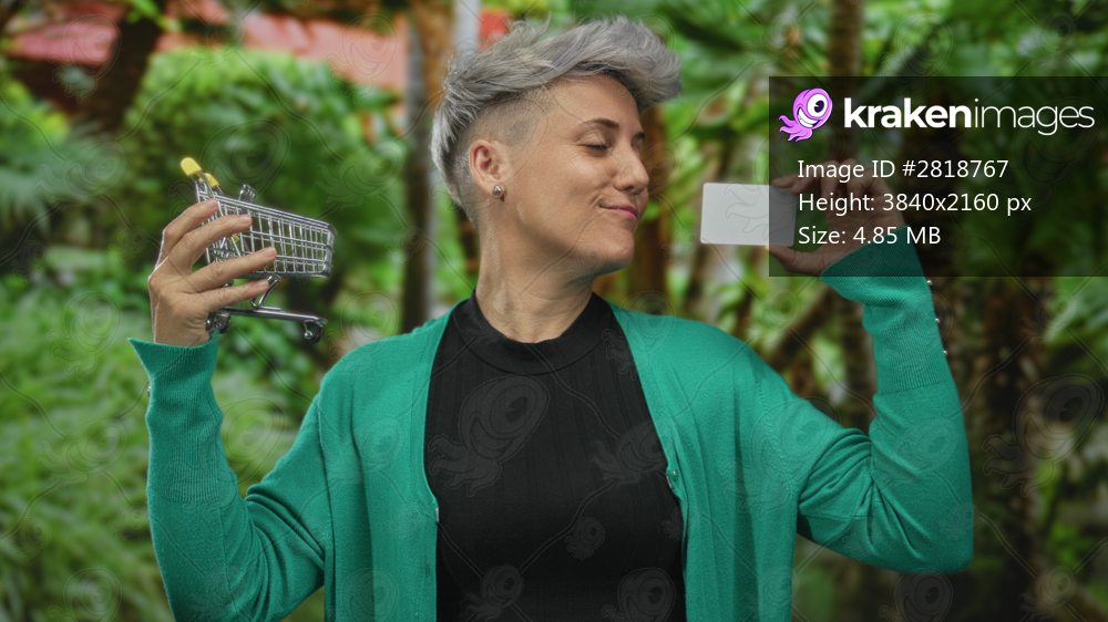 Caucasian woman with short hair holds a miniature shopping cart and creditcard while smiling in a green park setting; consumer choice.