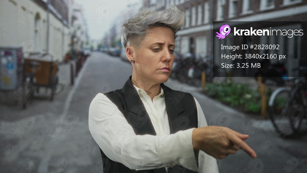 Caucasian woman with short hair and neutral expression pointing finger to street lined with brick buildings; determination direction.