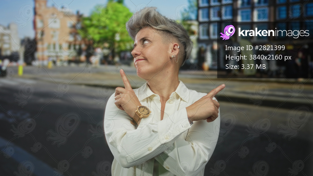 Caucasian woman with short hair pointing finger to opposite sides on city street while wearing a wooden watch; indecision.