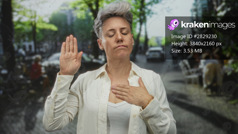 Caucasian woman with short hair raises her hand and places palm against her chest in a bustling street; sincerity.