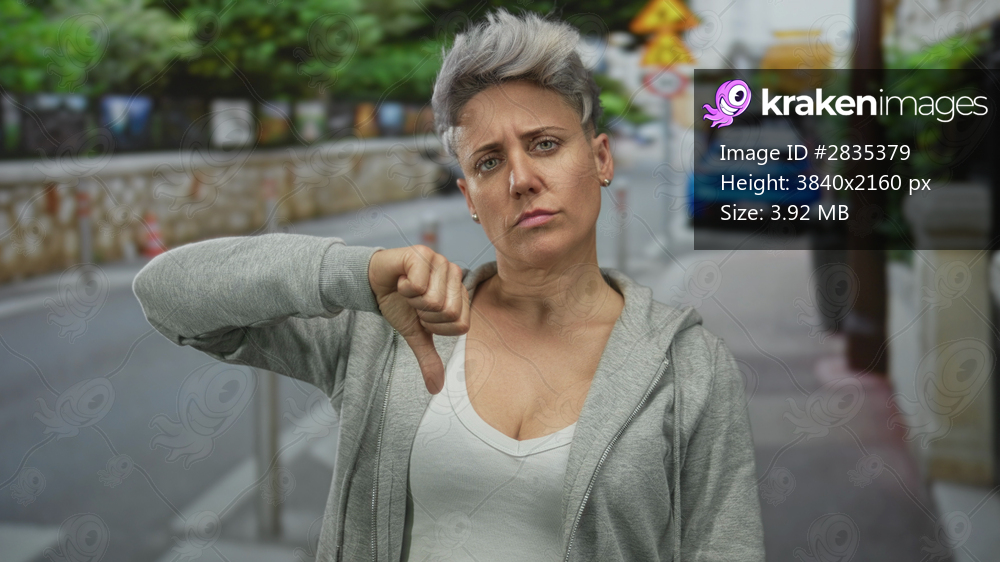 Caucasian woman with short hair stands on a city street sidewalk and gives a thumbs down gesture in front of a blurred car; disapproval.