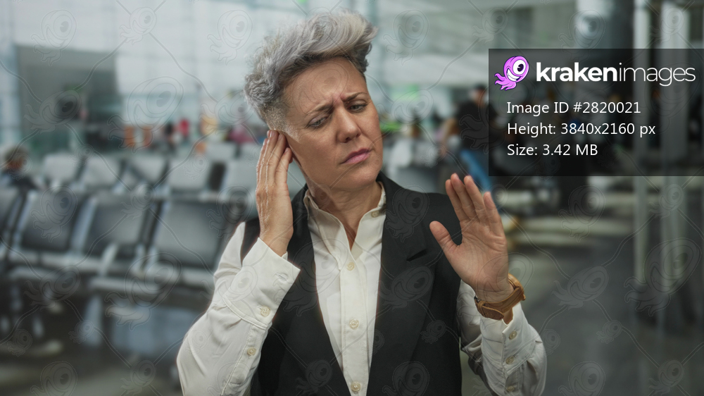 Caucasian woman with short silver hair wearing waistcoat holds hand to ear at airport terminal; frustration.