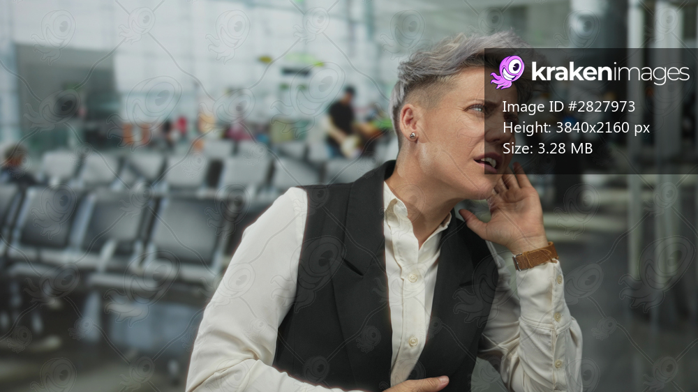 Caucasian woman with short silver hair wearing waistcoat holds hand to ear at airport terminal; frustration.
