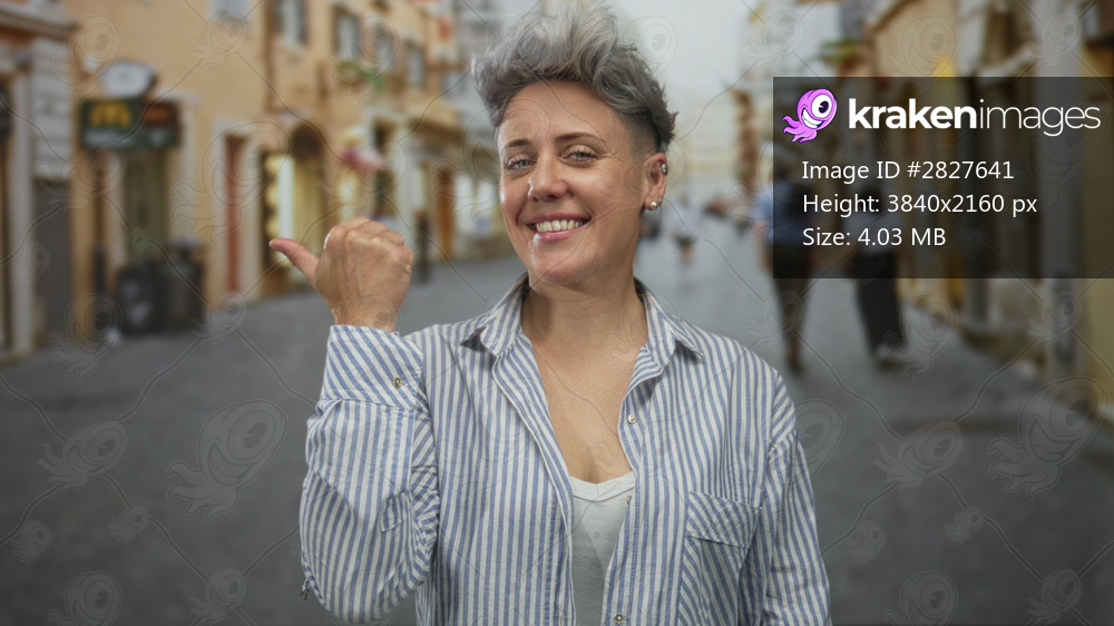 Caucasian woman smiling and pointing thumb on a busy city street lined with shops and blurred pedestrians; confidence.