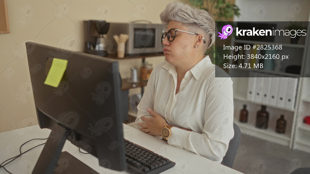 Caucasian woman wearing glasses holds stomach while typing on computer at office desk with monitor; discomfort.