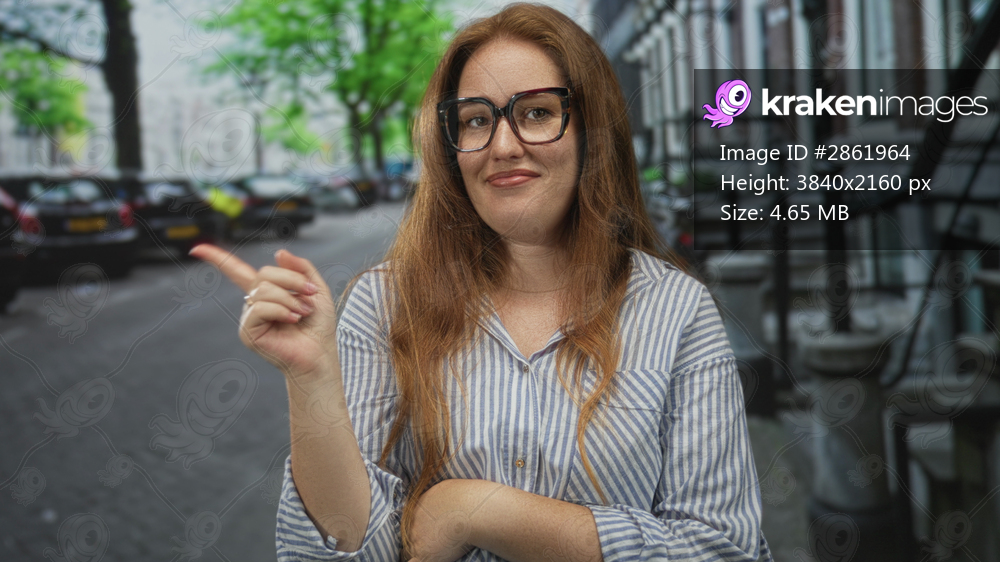 Caucasian woman wearing glasses pointing finger forward on street flanked by parked cars; confidence.