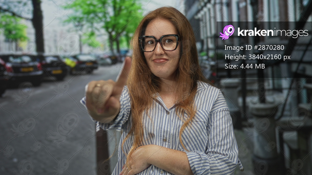 Caucasian woman wearing glasses pointing finger forward on street flanked by parked cars; confidence.