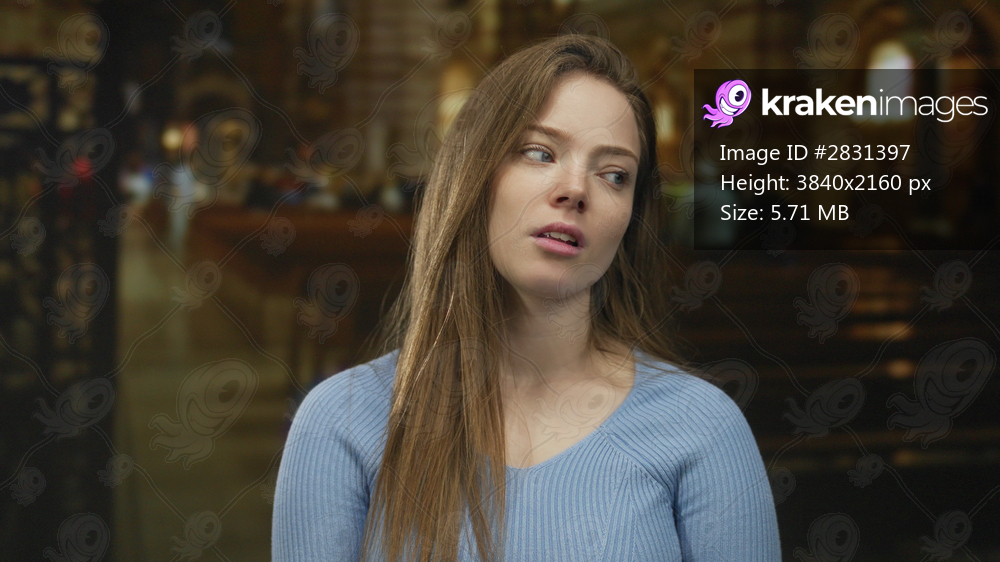 Caucasian young woman face turned sideways inside ornate church building in blue sweater; contemplation.
