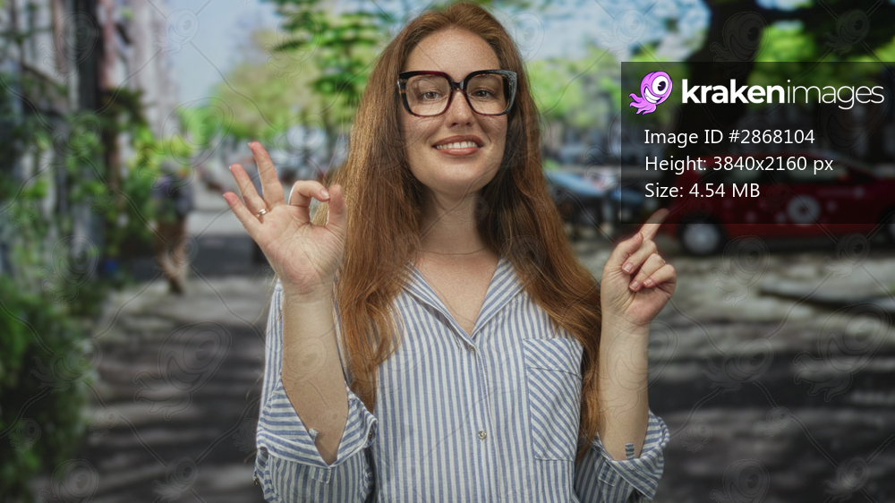 Caucasian young woman in striped shirt makes ok sign with hand while standing on a sunny tree lined street; approval.