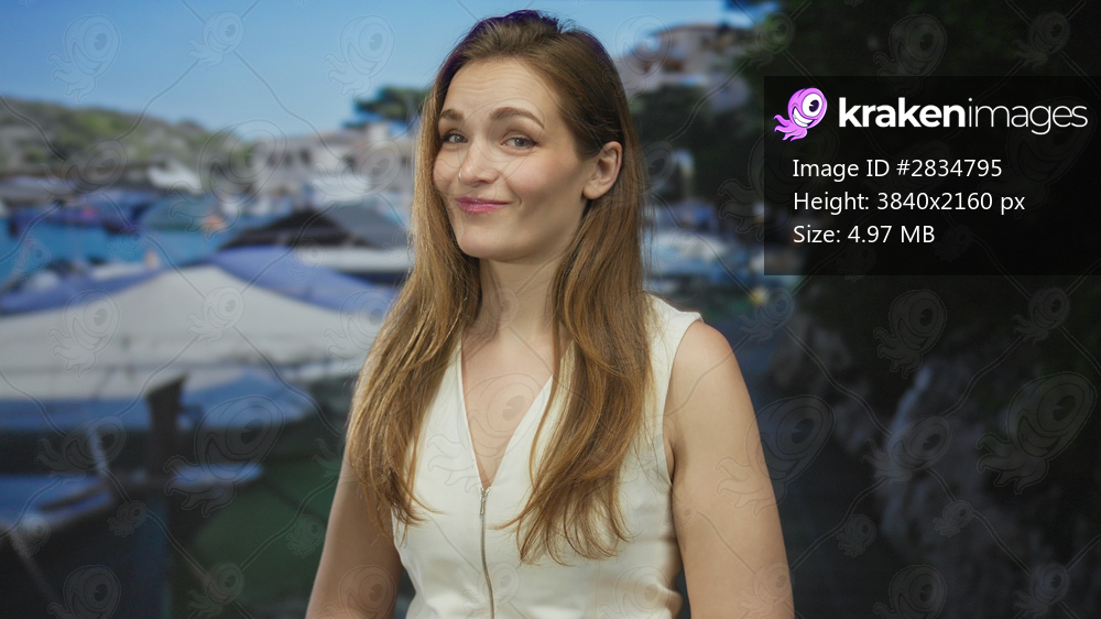 Caucasian young woman points finger at boat in port under bright sunny sky with subtle smirk; skepticism.