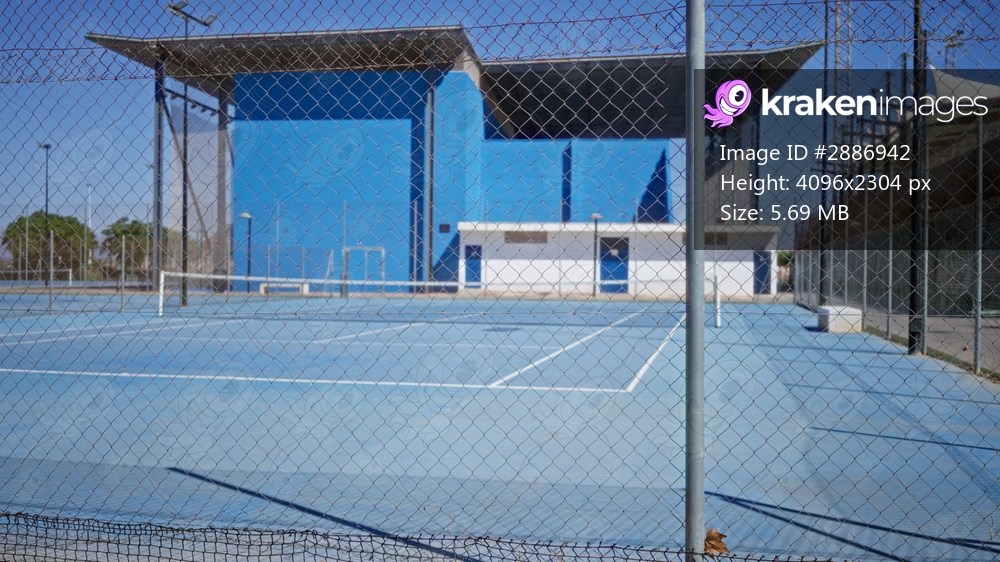 Chainlink fence sharp foreground with defocused blue tennis court and distant sports building outdoor; background backdrop copyspace calm.