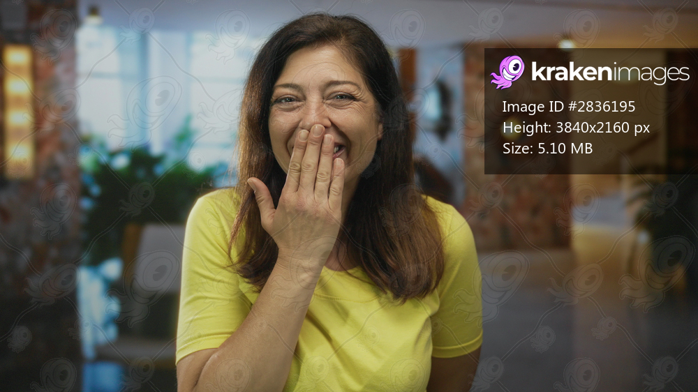 Cheerful hispanic middle aged woman covers mouth with hand in hotel lobby setting while smiling broadly with eyes closed; amusement surprise warmth joy. - Kraken Images