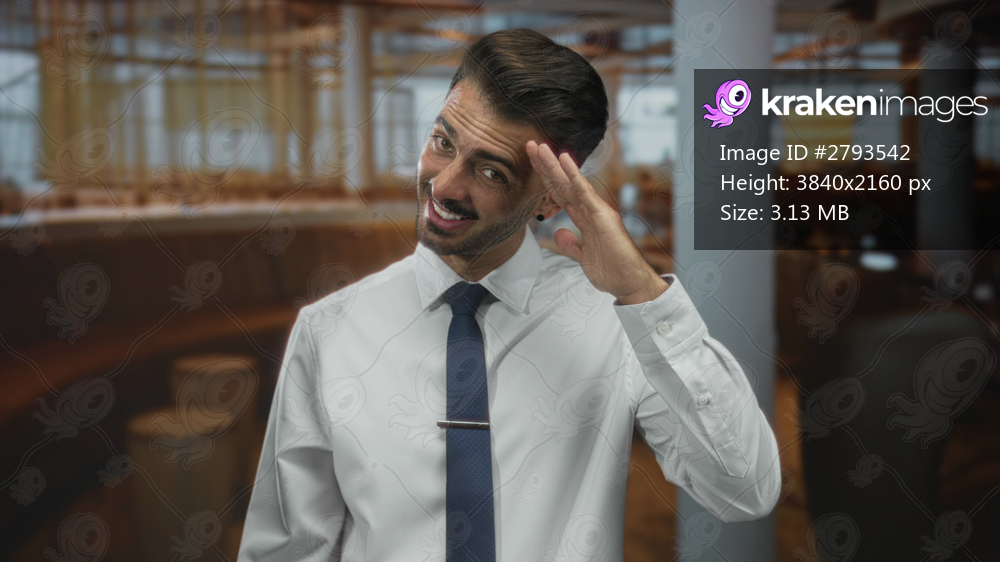 Cheerful young hispanic man in white shirt and blue tie with tie clip waves hand in building; greeting welcome.