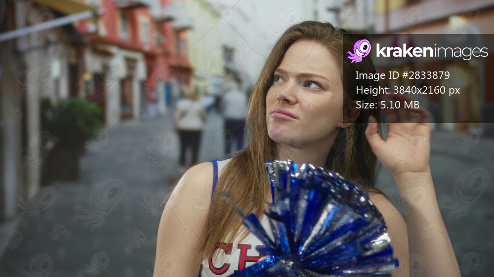 Cheerleader adjusts hair while holding metallic blue pompom on sunlit crowded city street; self doubt.