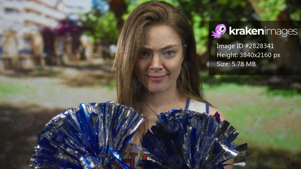Cheerleader holds blue metallic pom poms in green park under bright sunshine; energy motivation spirit.