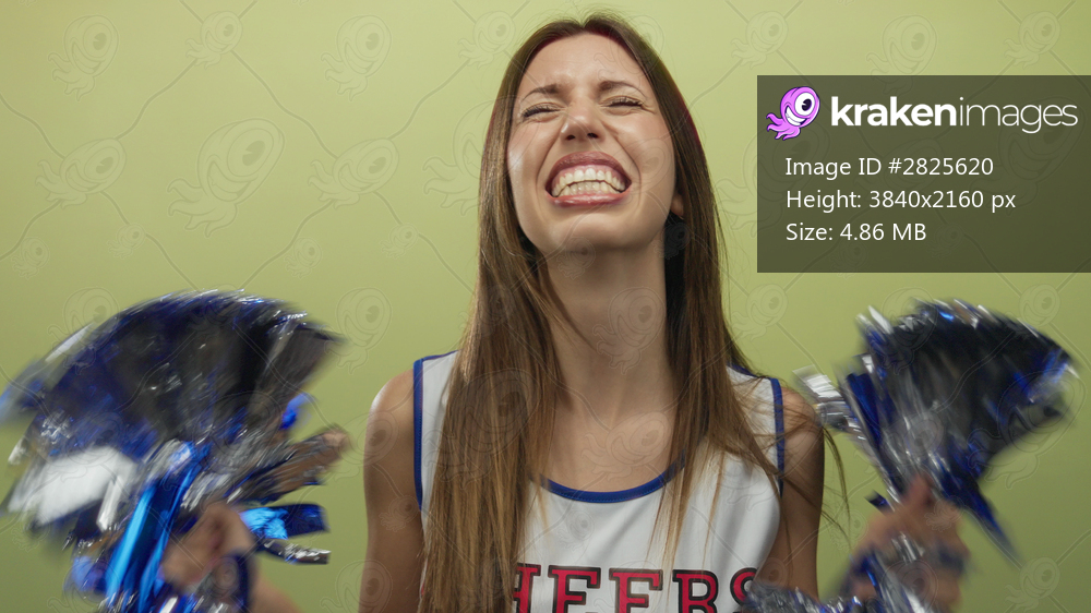Cheerleader in white uniform grasping metallic pompom with grimacing mouth and visible teeth in green studio; disgust.