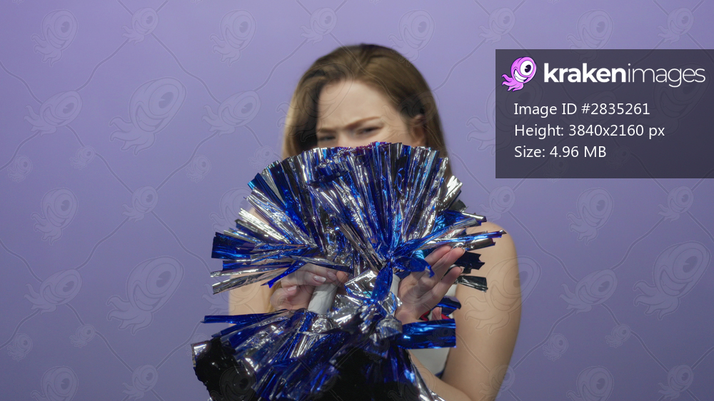Cheerleader squeezes metallic blue and silver pompom in bright purple studio with a squinting expression; frustration.