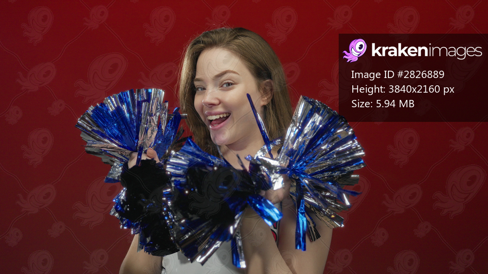 Cheerleader sticks out tongue while holding metallic pom poms in a studio with red background; celebration.