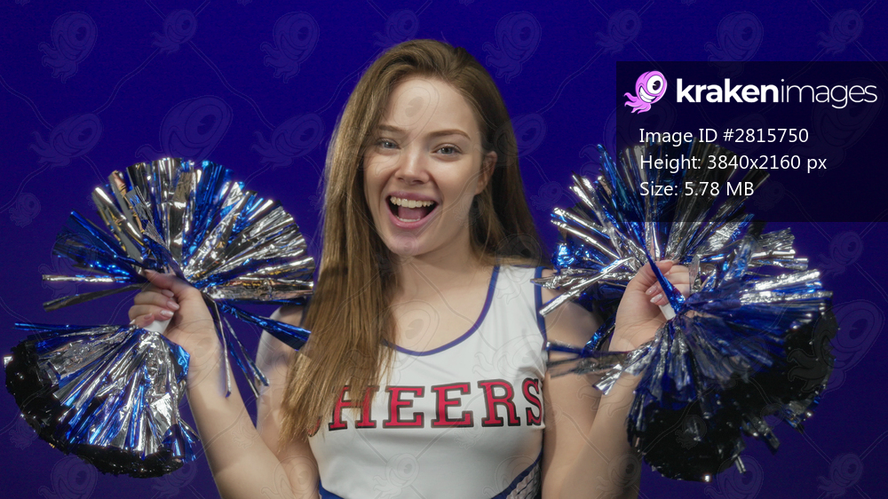Cheerleader woman holding blue and silver pompom with outstretched arms in studio with deep blue background; excitement.