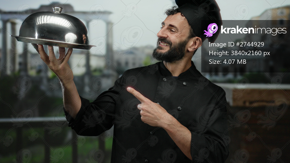 Chef with beard in black uniform holds a silver platter smiling in old town rome with ancient architecture in the background, showcasing culinary artistry. - Kraken Images