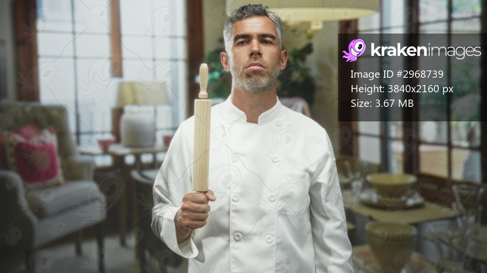 Chef with grey hair holding a rolling pin points finger at camera in a dining room inside a building; culinary authority.