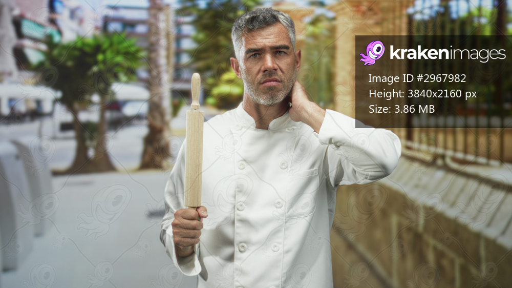 Chef man in white jacket holds rolling pin and rubs his neck for neckache in street; work stress fatigue.