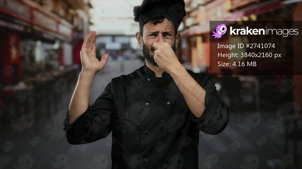 Chef outdoors on street, dressed in black uniform, pinches nose against malodor, expressive beard emphasizing reaction to unpleasant scent in bustling setting. - Kraken Images
