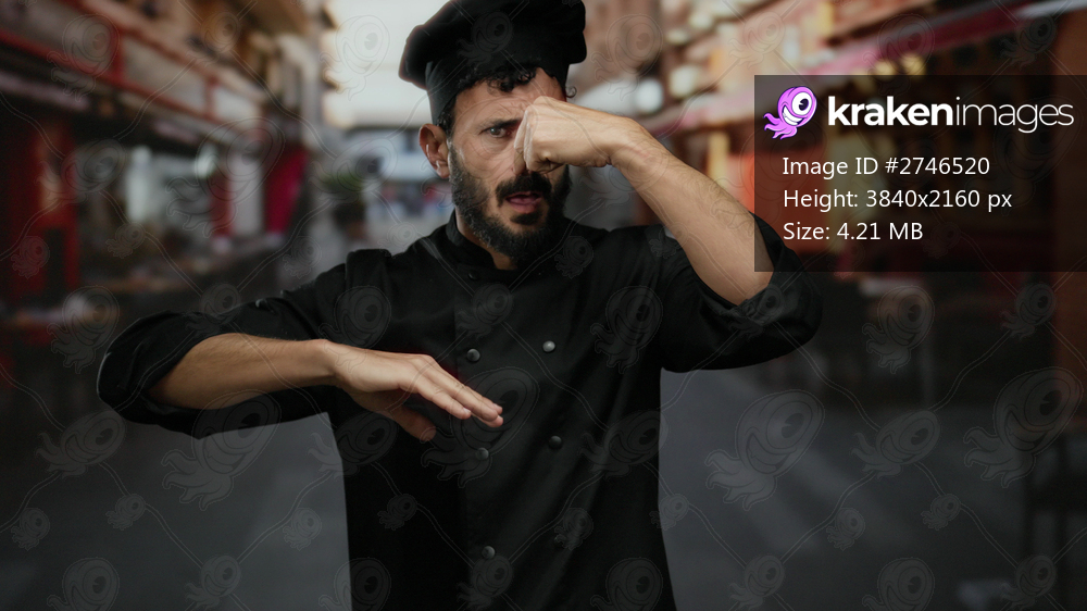 Chef outdoors on street, dressed in black uniform, pinches nose against malodor, expressive beard emphasizing reaction to unpleasant scent in bustling setting. - Kraken Images