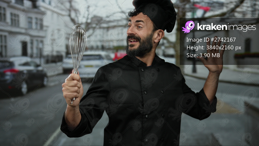 Chef smiling outdoors on street holding whisk wearing black uniform standing beside parked cars.