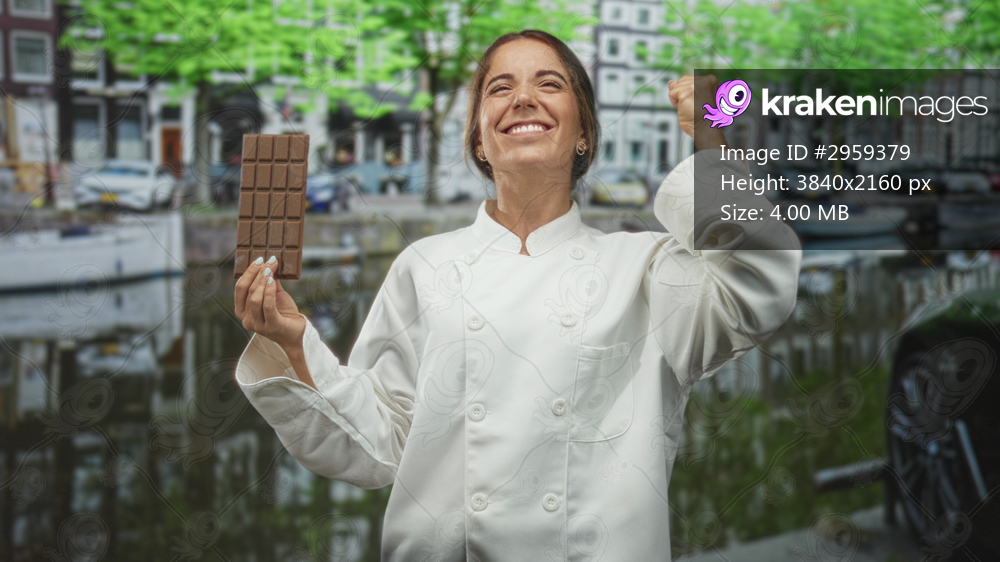 Chef woman in white coat holding chocolate bar, fist raised, smiling on a street by a canal; pride success.
