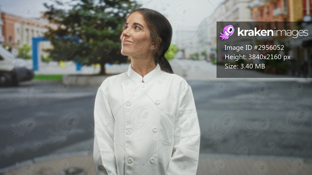 Chef woman in white jacket looks up, face visible with a faint smile on a street of a downtown town; hopeful ambition.