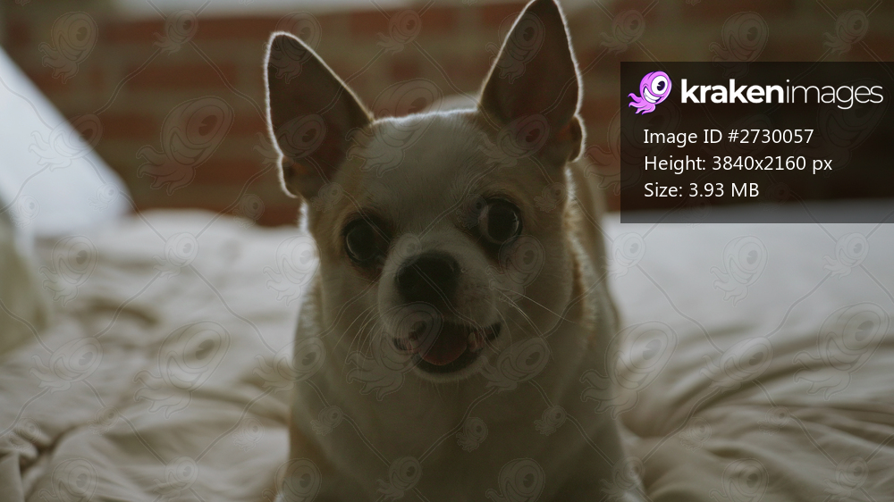 Chihuahua barking energetically on a comfortable bed in a cozy bedroom, showcasing its white and brown fur against a rustic brick wall backdrop.