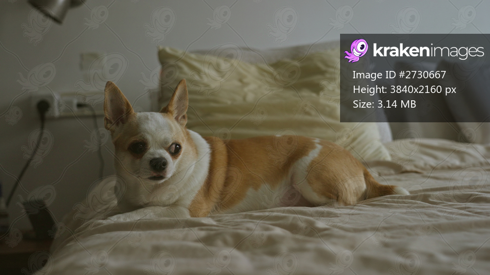 Chihuahua dog lounging on bed in cozy bedroom setting, highlighting its white and brown fur amidst a peaceful house environment.