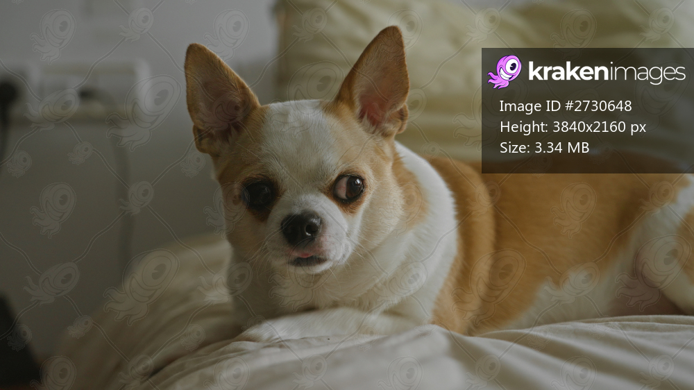 Chihuahua dog resting comfortably on a bed in a cozy bedroom setting at home, showcasing its smooth white and brown fur.