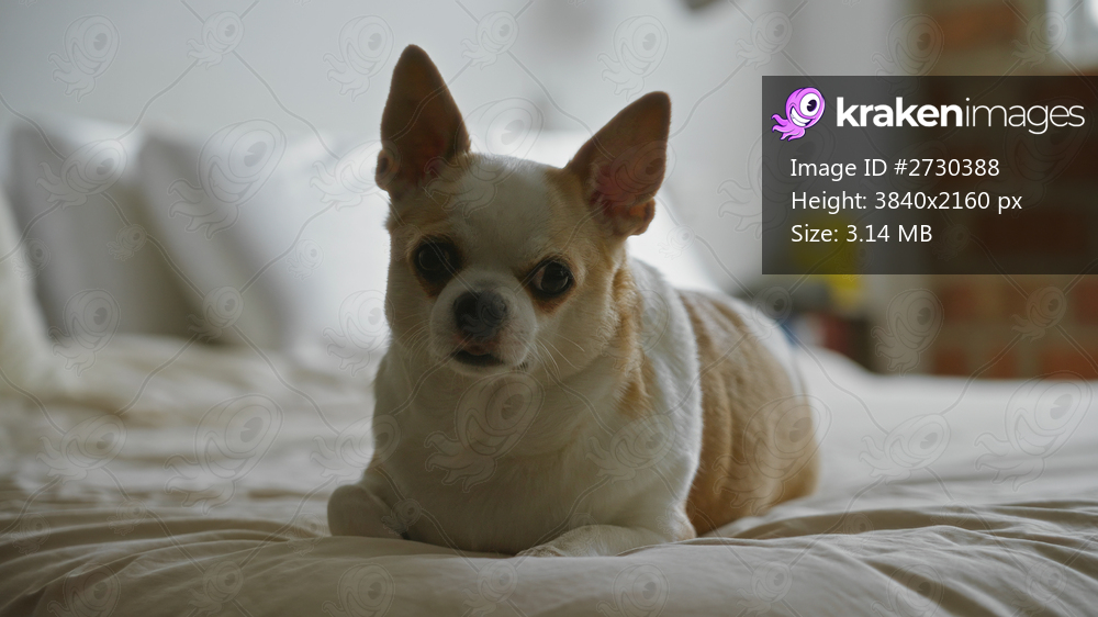 Chihuahua dog resting on a bed in a cozy bedroom of a house with white walls and brown accents, creating a serene and inviting home atmosphere with a cute pet. - Kraken Images